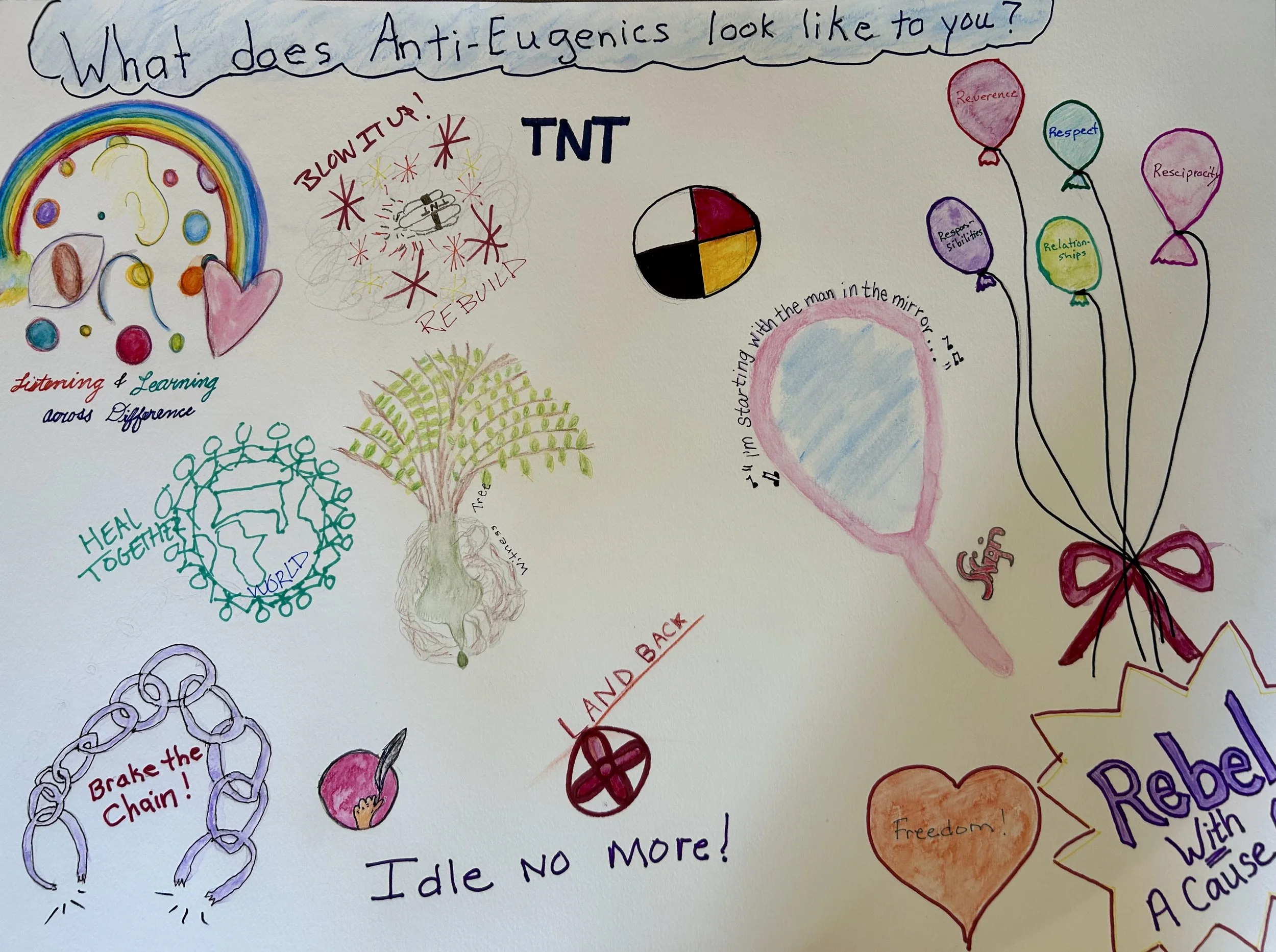 Gedakina organized a “What does Anti-Eugenics Look Like to You?” class this past week in our office in Princeton, Maine. We were joined by ten educators as well as Benedict Ipgrave from a global Anti-Eugenics project at the University College of London. The morning topics covered the history of eugenics in Vermont, New Hampshire and Maine, and how they were and are connected today. In the afternoon, Benedict followed up with Anti-Eugenics, the history and movement of the project. In addition to learning about some difficult topics, we shared hope. Hope for a better future for the next generations. Hope where old systems are destroyed and new systems flourish, full of respect, responsibilities, relationships, reverence and reciprocity.